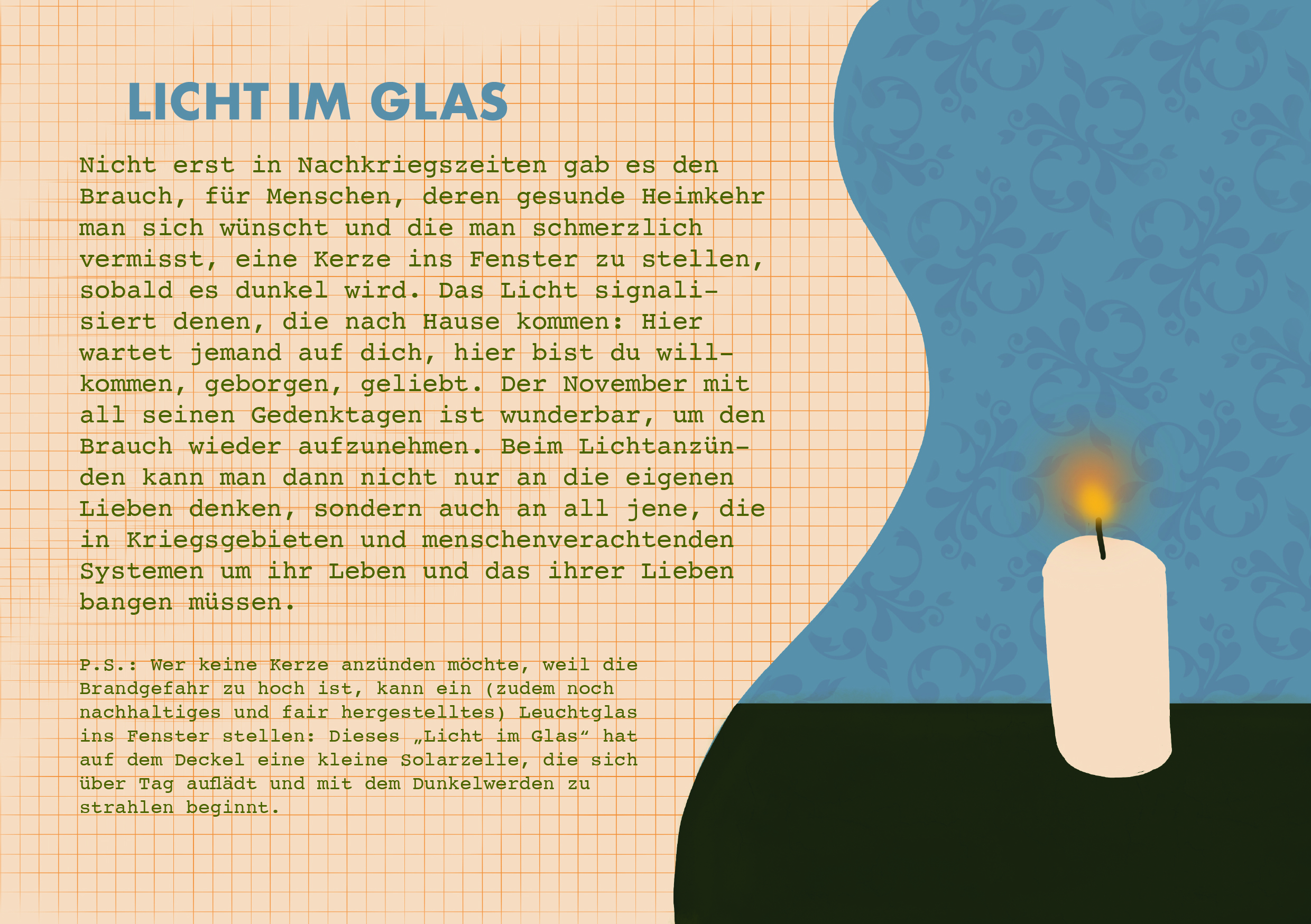 Es ist da! Das „Novemberlicht“ ist im Handel angekommen. Hier klicken und schon mal schauen.  Ich bin sehr gespannt, wie es Euch gefällt. „Mehr Licht“, soll Goethe gesagt haben. Licht brauchen wir jetzt besonders. Möge es heller und wärmer werden: Wir sind es, die die Welt erhellen. Hier könnt Ihr auch online stöbern und bestellen.