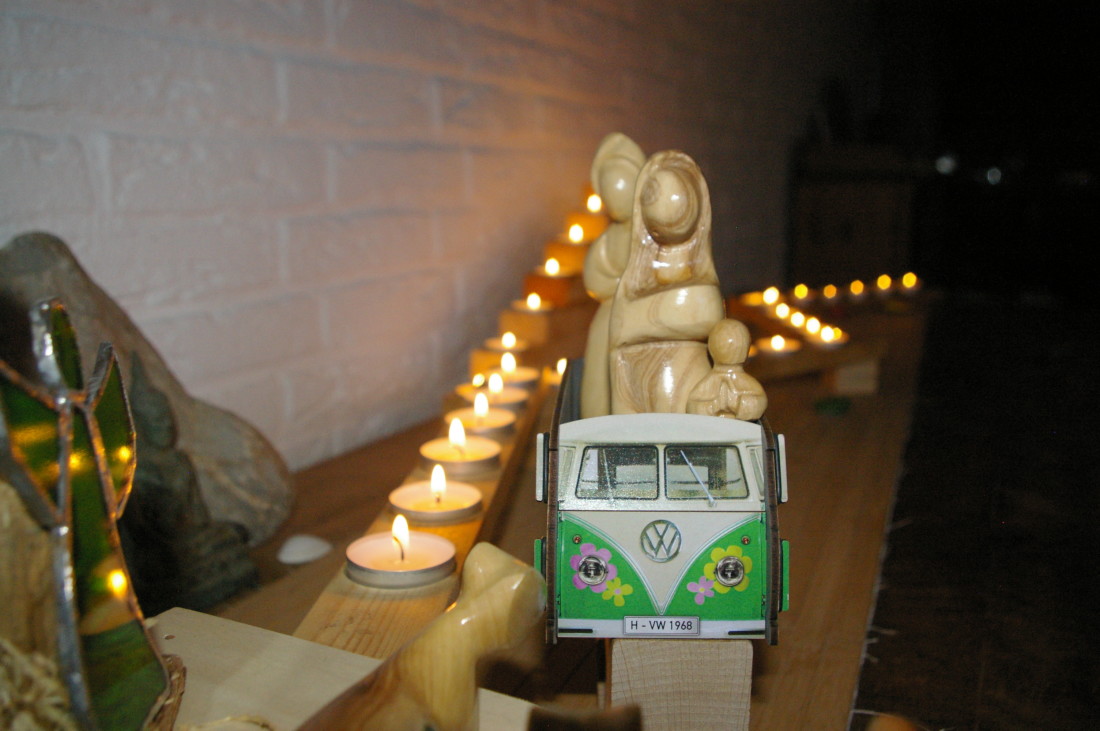 Okay. Irgendwann haben Maria und Josef auf ihrer beschwerlichen Adventswanderung Adventsweg auf einmal Flowerpower-VW-Bus- Unterstützung bekommen. Bei Kerze 15 hatte ein Pubertist sie dort reingesetzt. Der Adventsweg war unser alternativer Adventskalender. Ich wollte nicht noch mehr Geschenke. Auch nicht als Gutscheine, bunte Plastiksteinchen oder Schokolade. Ich wollte Licht und Geschichten und erzählen. Das hat wunderbar funktioniert. Was also mache ich also hier: Bin ich denn von allen guten Muttergeistern verlassen?