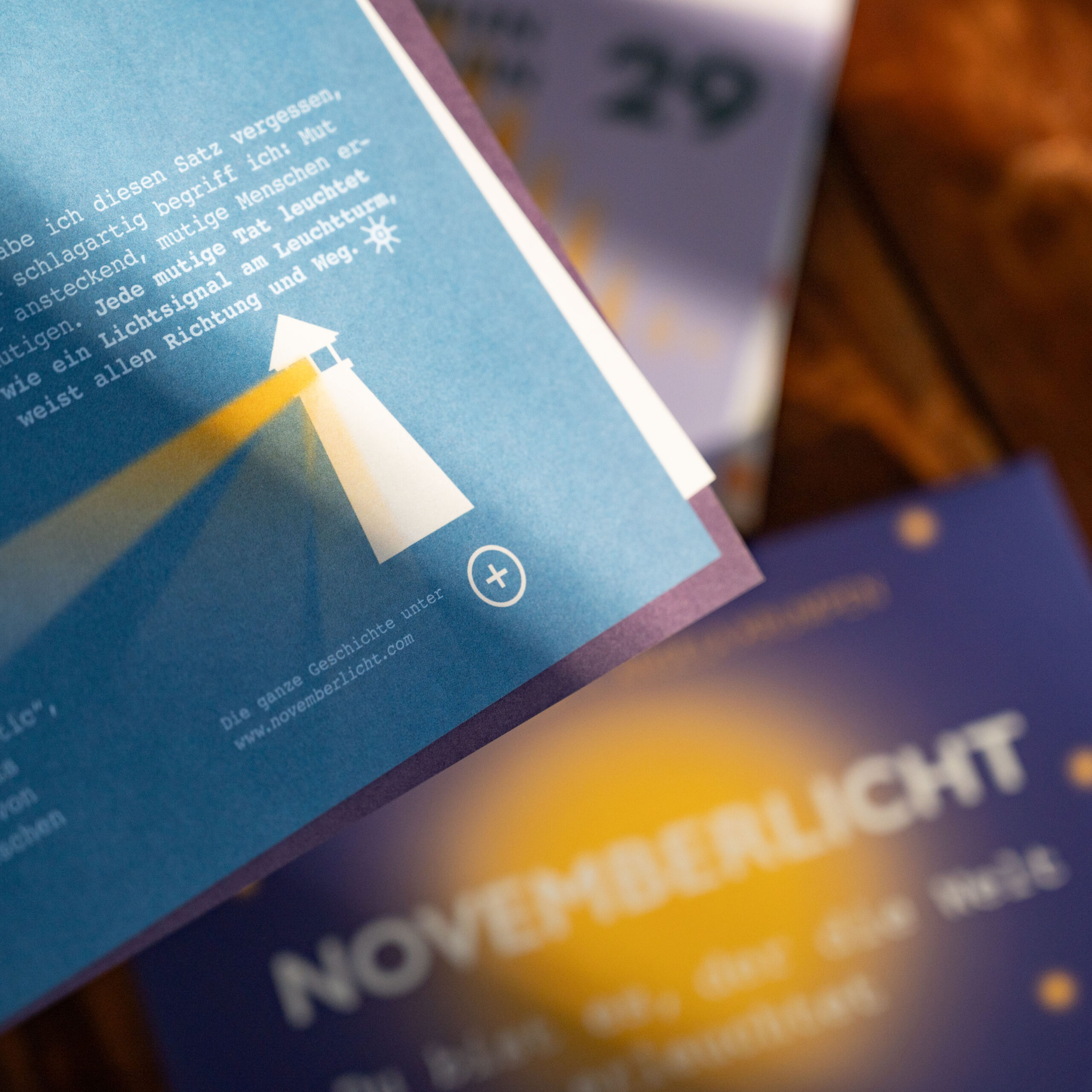 Es ist da! Das „Novemberlicht“ ist im Handel angekommen. Hier klicken und schon mal schauen. Ich bin sehr gespannt, wie es Euch gefällt. „Mehr Licht“, soll Goethe gesagt haben. Licht brauchen wir jetzt besonders. Möge es heller und wärmer werden: Wir sind es, die die Welt erhellen. Hier könnt Ihr auch online stöbern und bestellen.
